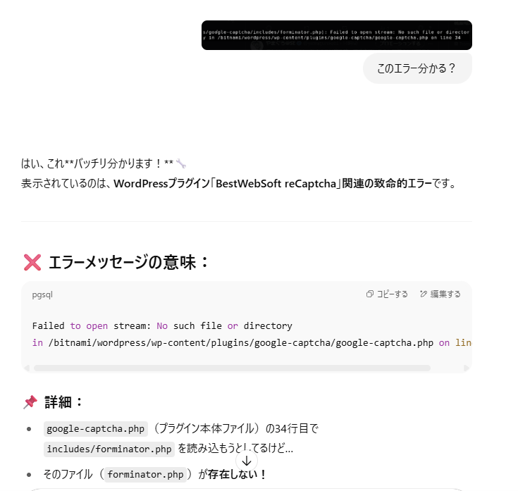 正直この辺りはエンジニア作業ではありますが、最近ならエラー箇所をスクショしてChatGPTとかのAIに投げれば、おおよそのエラー内容を教えてくれます。個人でやる分にはこの方法で充分だと思います!