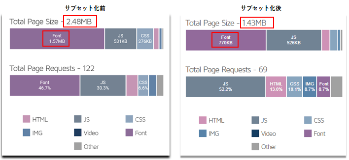 ページ全体のサイズが2.48MB→1.43MBとなり、約1Mの低減に成功しました。やったぜ。また、今回手を入れたフォントのサイズの部分も1.57MB→770KBと約半分になりました。