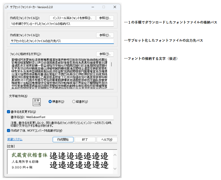 - 作成後フォントファイル:サブセット化したフォントファイルの出力先を指定