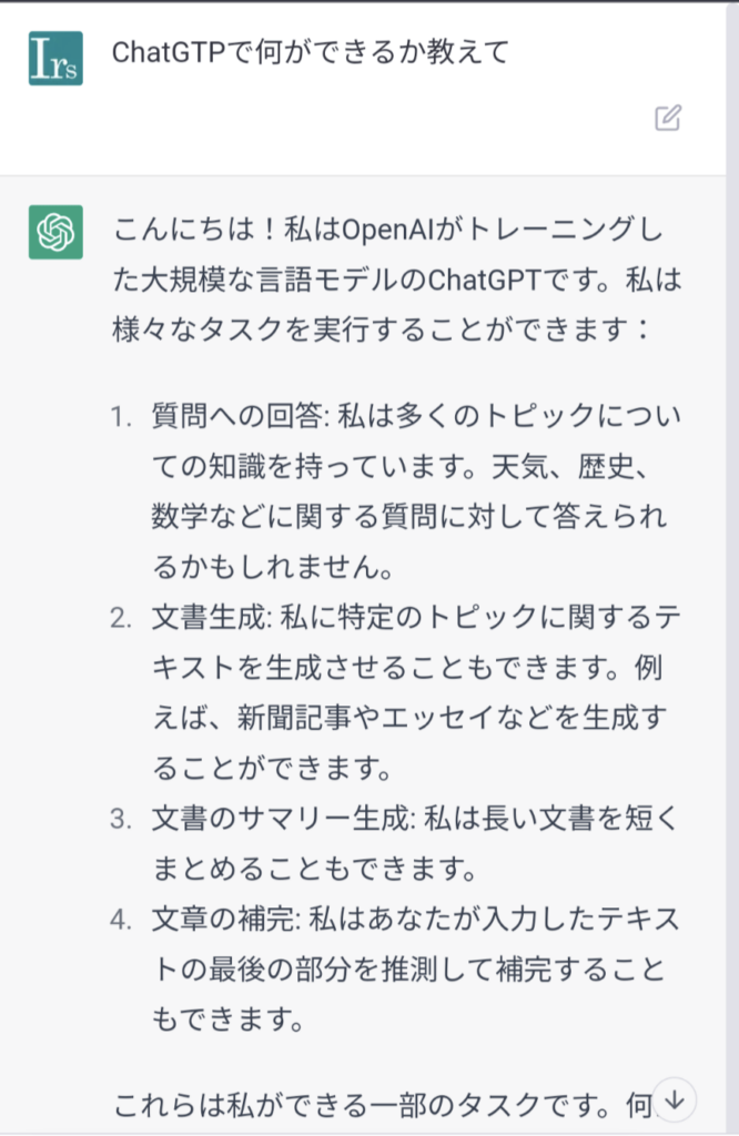 こういうのは本人に聞いたほうが良いような気がしたので、ChatGTPに「ChatGTPで何ができるか教えて」と質問を投げてみた。