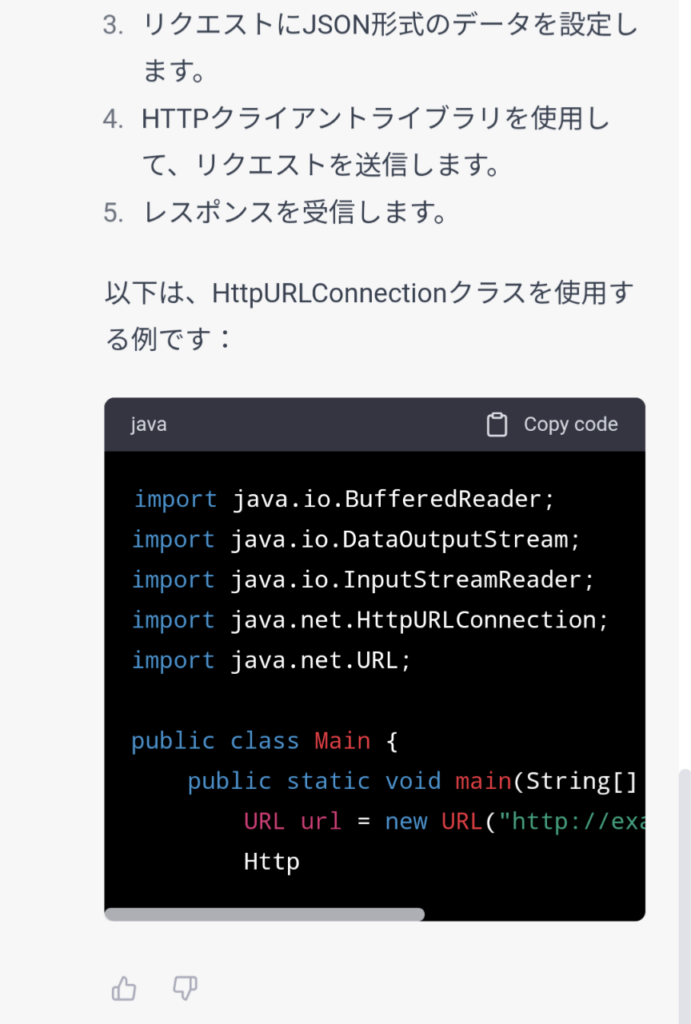 文字数制限なのか途中で切れてしまったので、「HttpURLConnectionを利用した方法を教えて」と追加質問をしたら、しっかりコードが返ってきた。