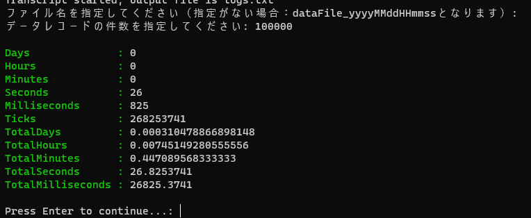 TotalMilliseconds : 26825.3741処理にかかった時間は26秒。なんと改善前と比較すると実に15分くらいの処理性能の違いだ。10万件でこの処理性能の差が出るわけだから、実際の業務で想定し得る100万件、1,000万件のデータを捌いたときにはもっと大きい差が出るはず。