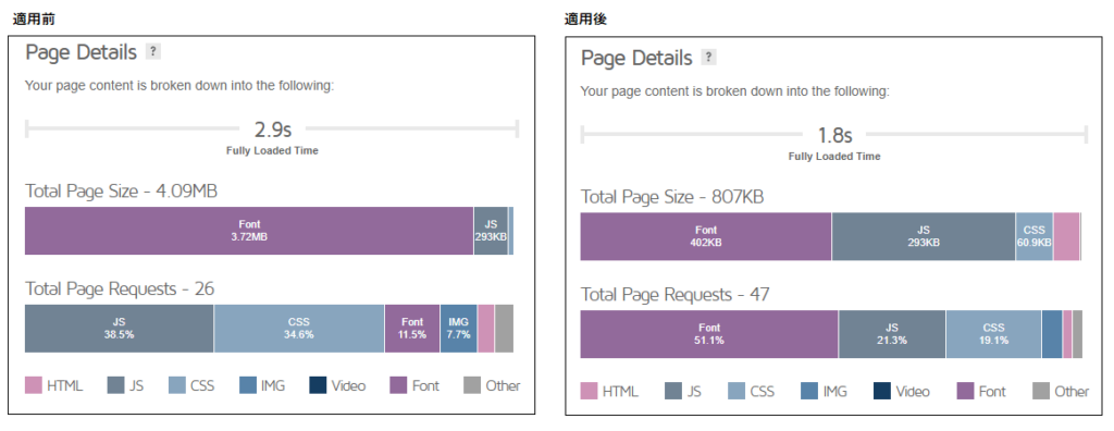 ページの読み込み速度はだいたい1秒ほど早くなっていますね。で、ここで驚くのはTotalPageSizeの部分です。約4.1Mほどあったのが、0.8Mほどに改善されています。それもそのはず、もともと3.7Mあったフォントファイルのサイズが402KBになっているのです。これは、Cloudflare Fontsによって、フォントファイルがキャッシュされて配信されているからです。