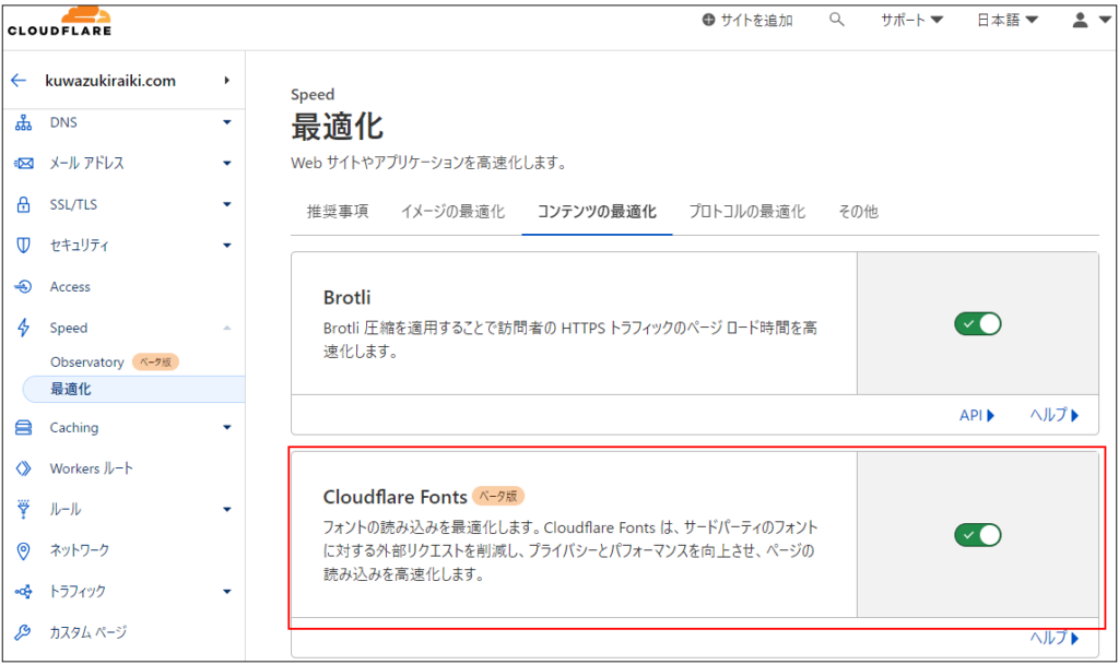 Cloudflare Fontsの利用は、Cloudflareのサイト別メニューに入り、「Speed」→「最適化」→「コンテンツの最適化」からトグルをONにすれば、すぐに利用可能になります。
