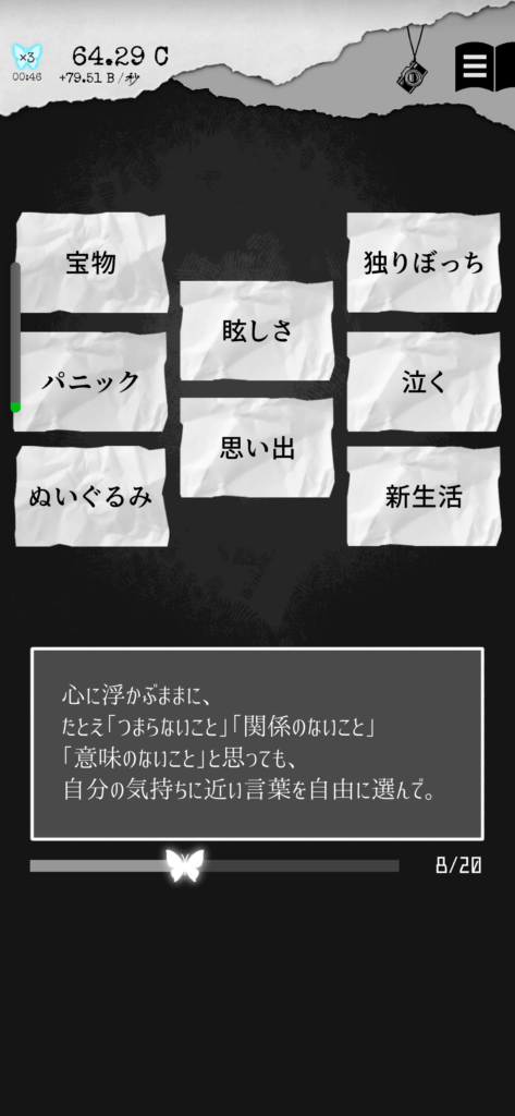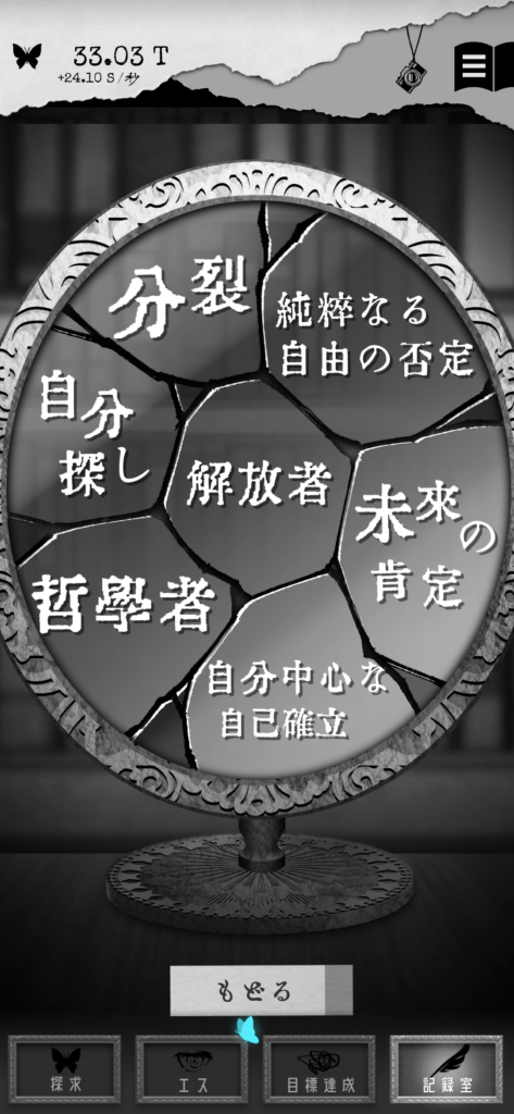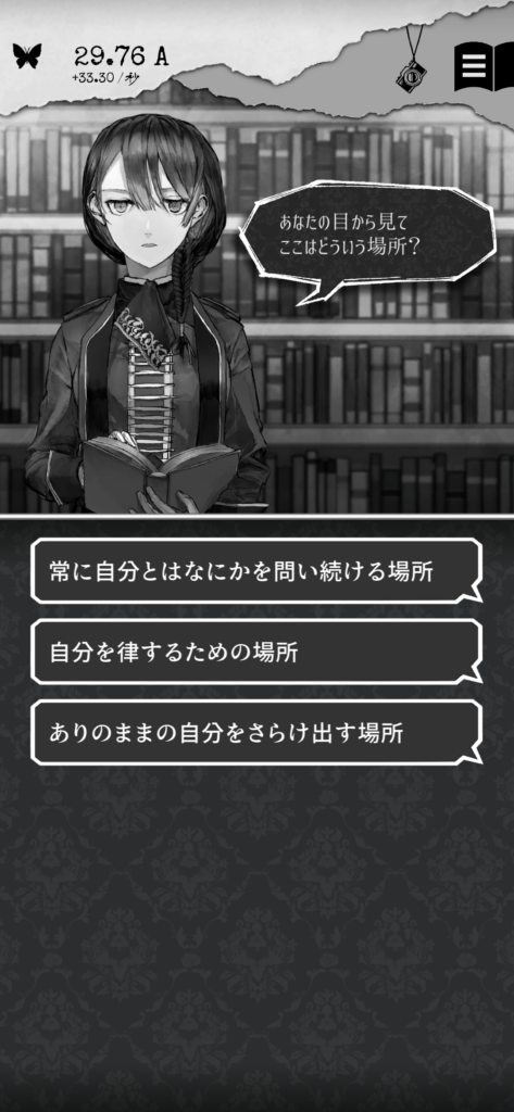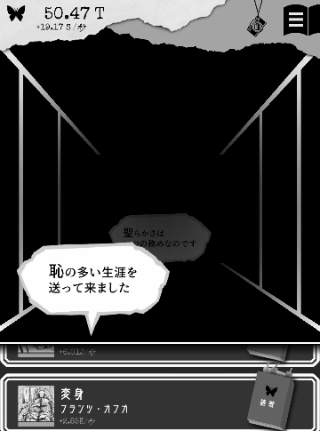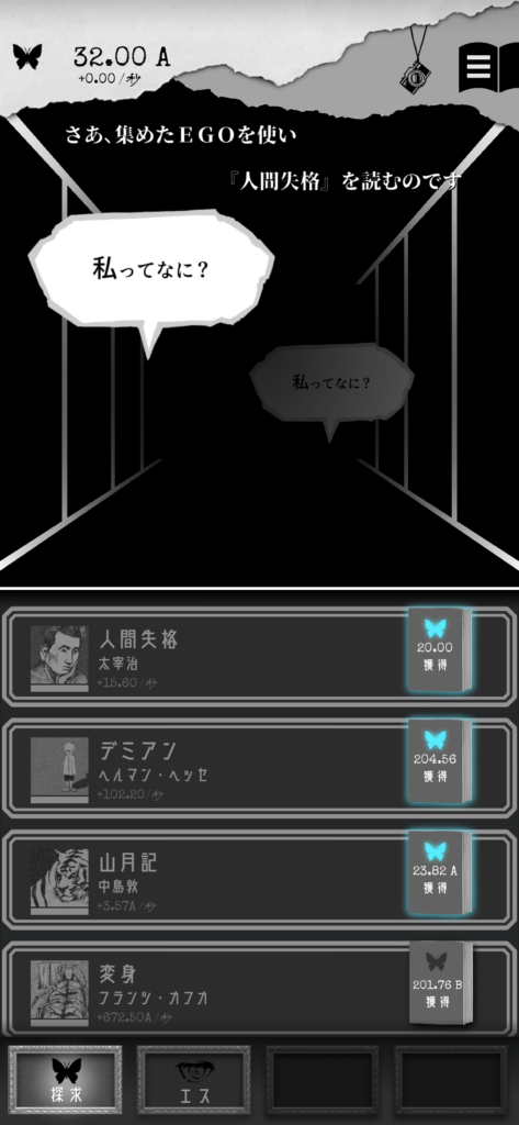 放置や画面タップで「EGO」というポイントを貯め、EGOを利用してストーリーをアンロックしていく、というアドベンチャーゲームです。また、EGOを効率よく貯めていくためには世界の文豪の作品を読み進めていく必要があったりするので(実際に読むわけではなく、あくまで作中の設定的なやつです)、小さい頃から読書家だった人には刺さるかも知れません。