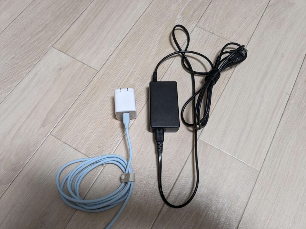 まず全体的なサイズ感を、一般的なPCの付属充電器と比較していきます。