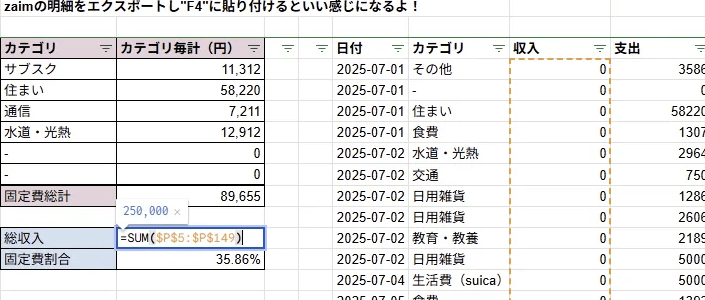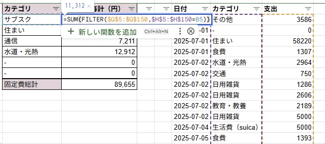 関数を使って、「固定費扱いとしたカテゴリ毎の集計」を行なっていきます。