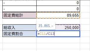 そして、固定費/総収入を計算します。(表示形式を%にしてます)