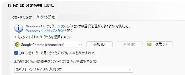 chrome.exeを追加 - 「優先するグラフィック プロセッサ」→ 高パフォーマンスNVIDIAプロセッサ