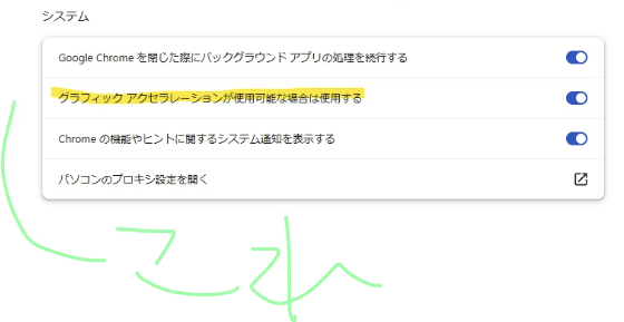 YouTubeを起動するブラウザのグラフィックプロセッサを固定する。どうやらこれの選択を自動にすると、「どれにしようかなあ?」みたいな感じになるっぽい。今回はChromeだけど、他のブラウザでも同手順。