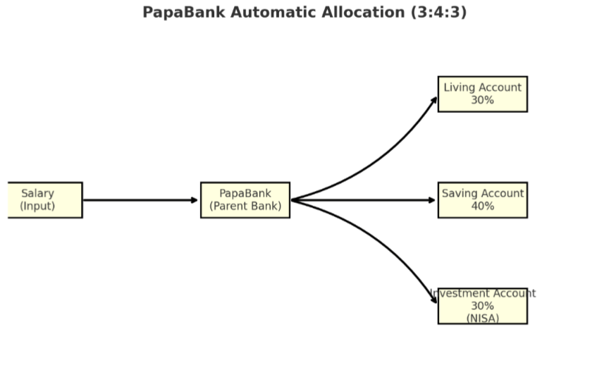 日本の“パパ=ATM”イメージを逆手にとり、親しみやすくキャッチーなネーミングに。また、パパがぱぱばんくを利用して家族用の銀行に自動送金することで、一部をちょろまかすことも可能!