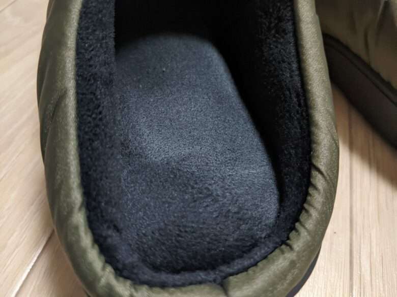 実際に履いてみると、見た目の印象通りちゃんと暖かいし、かかとがないのも気にならないくらい。なんなら普段履いてるスニーカーよりも暖かいくらい。