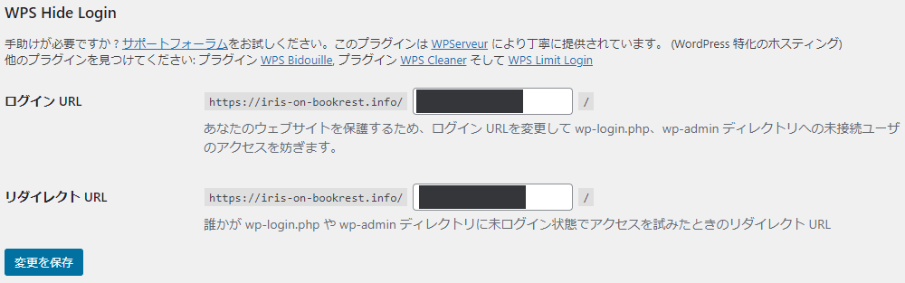 このプラグインをインストール&有効化すると管理ページの[設定]→[一般]の一番下の方にWPS Hide Loginの設定メニューが出てくるので、ここに新しいログインページを入れればOK。