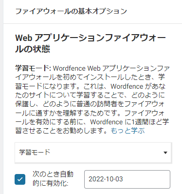 [Wordfence]→[ファイアウォール]と進んで、以下設定をして学習モードにする。