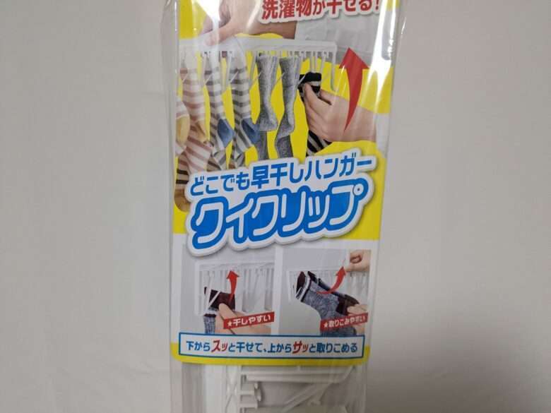 小物を干すハンガーはピンチの数が少ない事が多いけれど、クイクリップは10箇所にピンチがあるようなもんなので、一本で結構色んなものが干せてしまう。